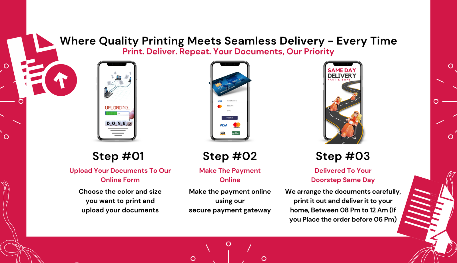 Get your documents printed from the comfort of your home by uploading them to our form below, pay online and get your documents delivered to you within the same day.